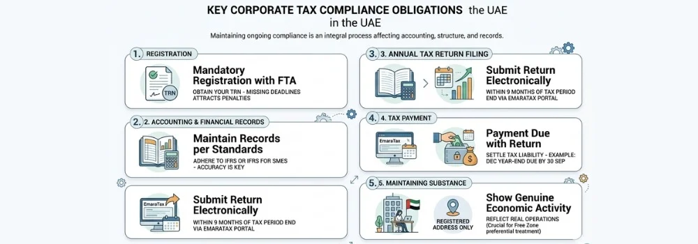 Staying compliant with UAE corporate tax law involves more than simply paying a bill once a year. It is an ongoing process that touches your accounting practices, legal structure, and record-keeping systems.
