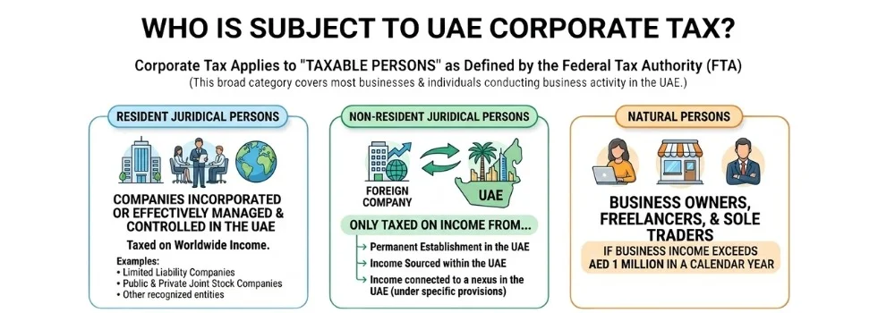 Corporate tax applies to what the Federal Tax Authority (FTA) defines as “taxable persons.” This broad category covers most businesses and individuals conducting business activity in the UAE.