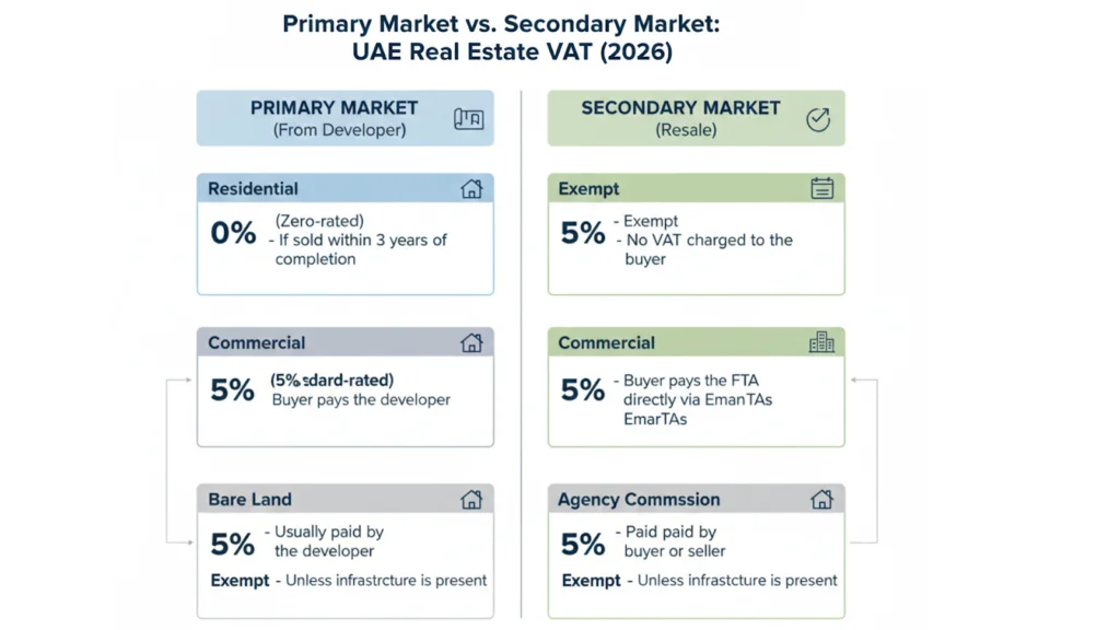 - Commercial Off-Plan: Always 5% VAT, regardless of the construction stage.