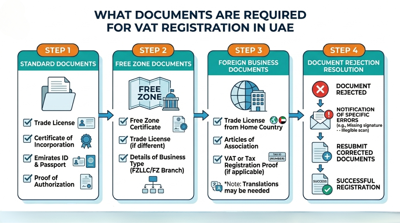 The biggest reason applications get rejected is because of the wrong papers. We look at your trade license, passport copies, and bank statements very carefully. We make sure everything is perfect before we send it to the Federal Tax Authority (FTA).